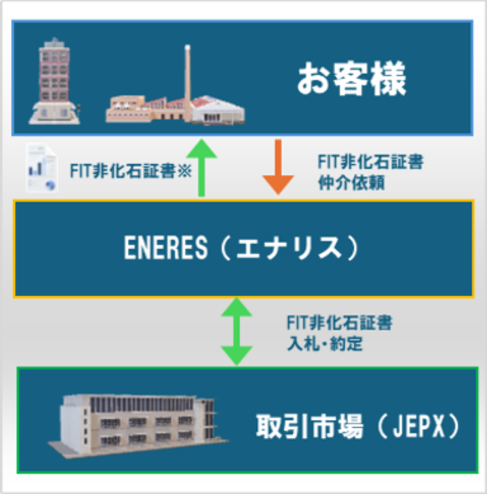 エナリスがお客様に代わりオークションに参加し、トラッキング付きFIT非化石証書を購入、お客様の電力使用にともなう温室効果ガス排出を実質的に削減できます。
